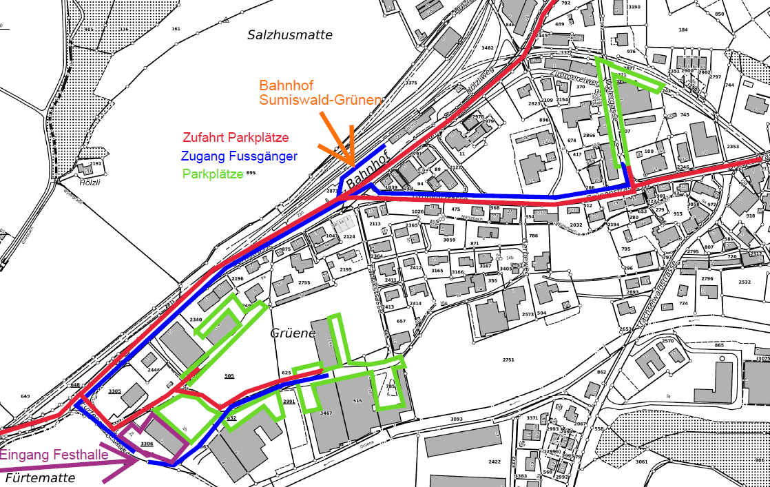 Das Festareal ist einfach mit dem ÖV zu erreichen, der Bahnhof Sumiswald-Grünen liegt ca. 5 Gehminuten vom Fest entfernt.